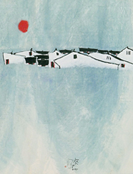 blue washes of colour with a singular red dot sun –